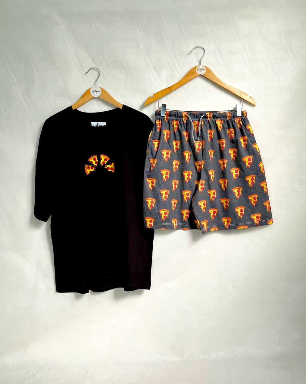 ست پیتزایی که شامل شلوارک پیتزایی تیشرت پیتزایی میباشد.