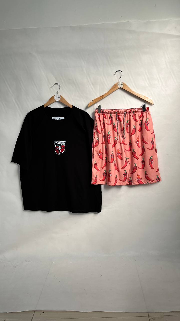 ست تیشرت و شلوارک فلفلی که شامل تیشرت فلفلی و شلوارک فلفلی میباشد.