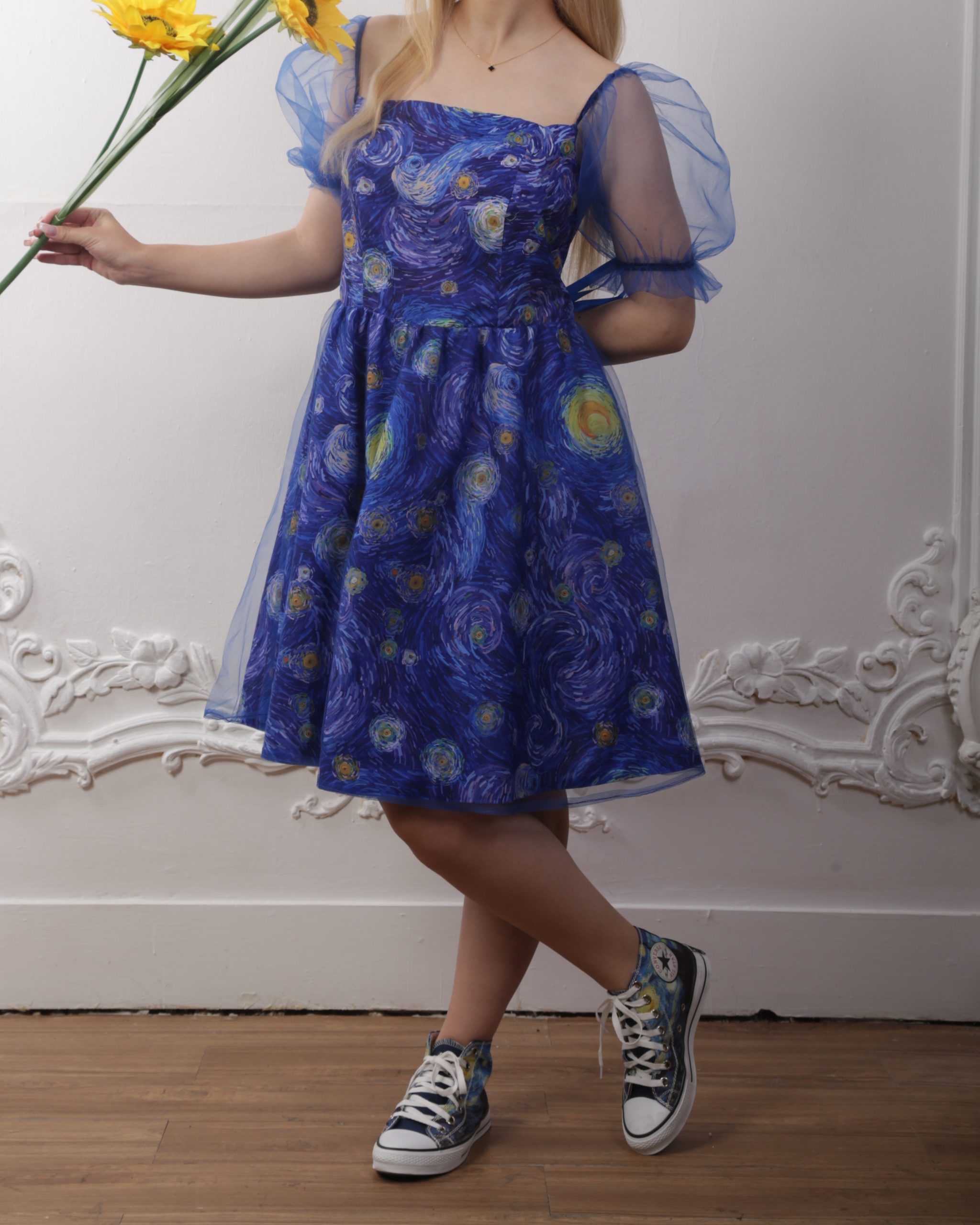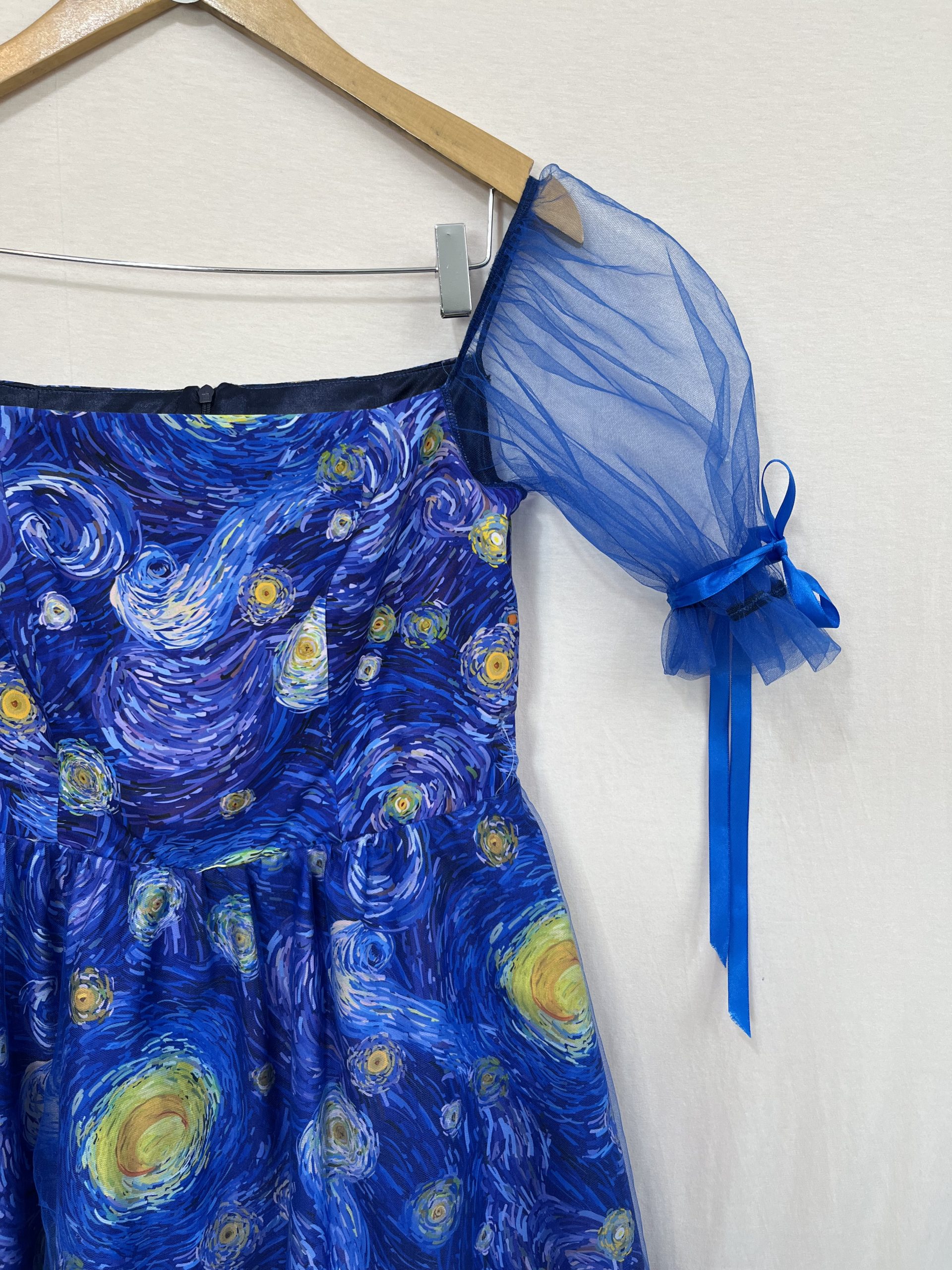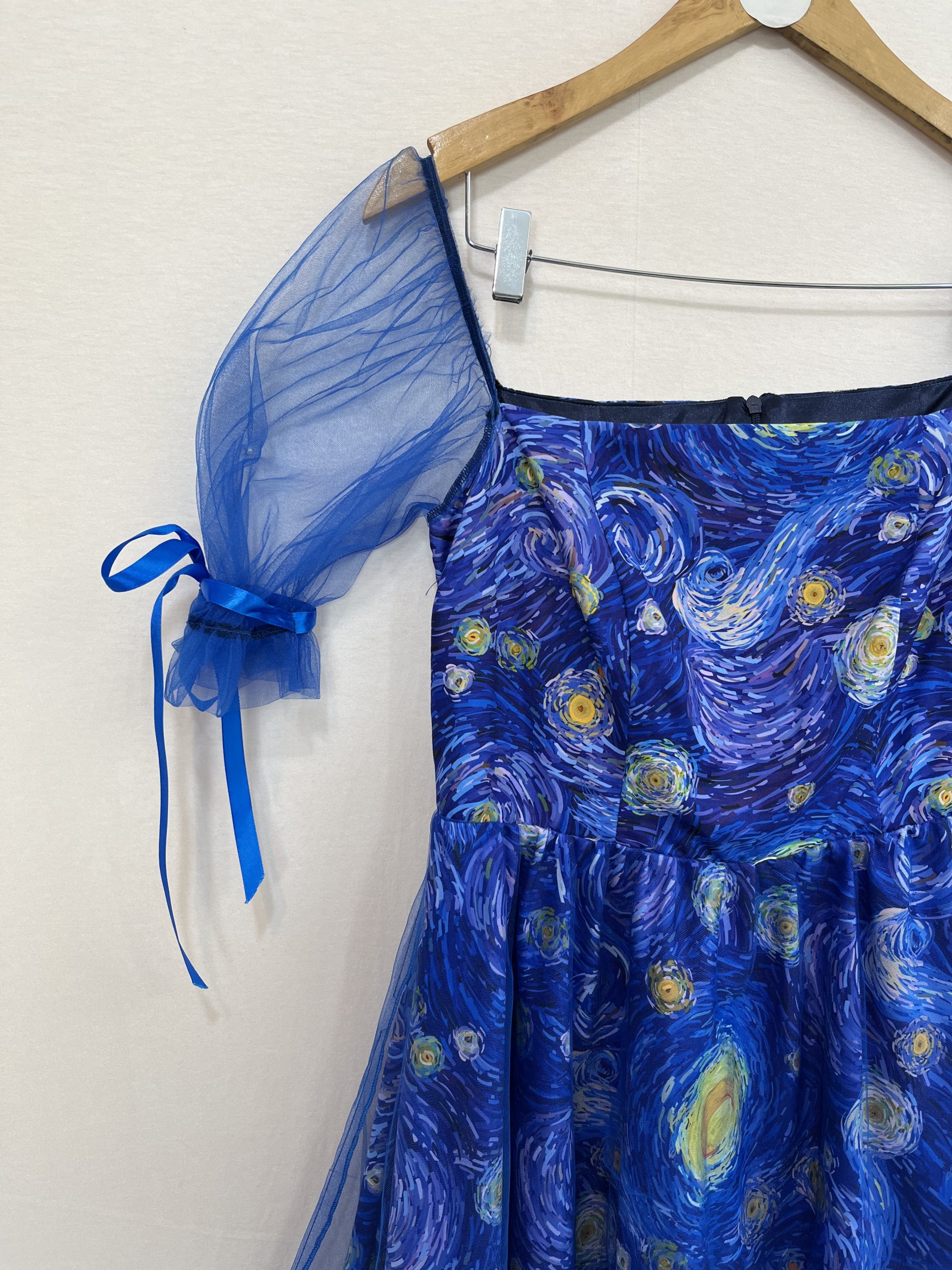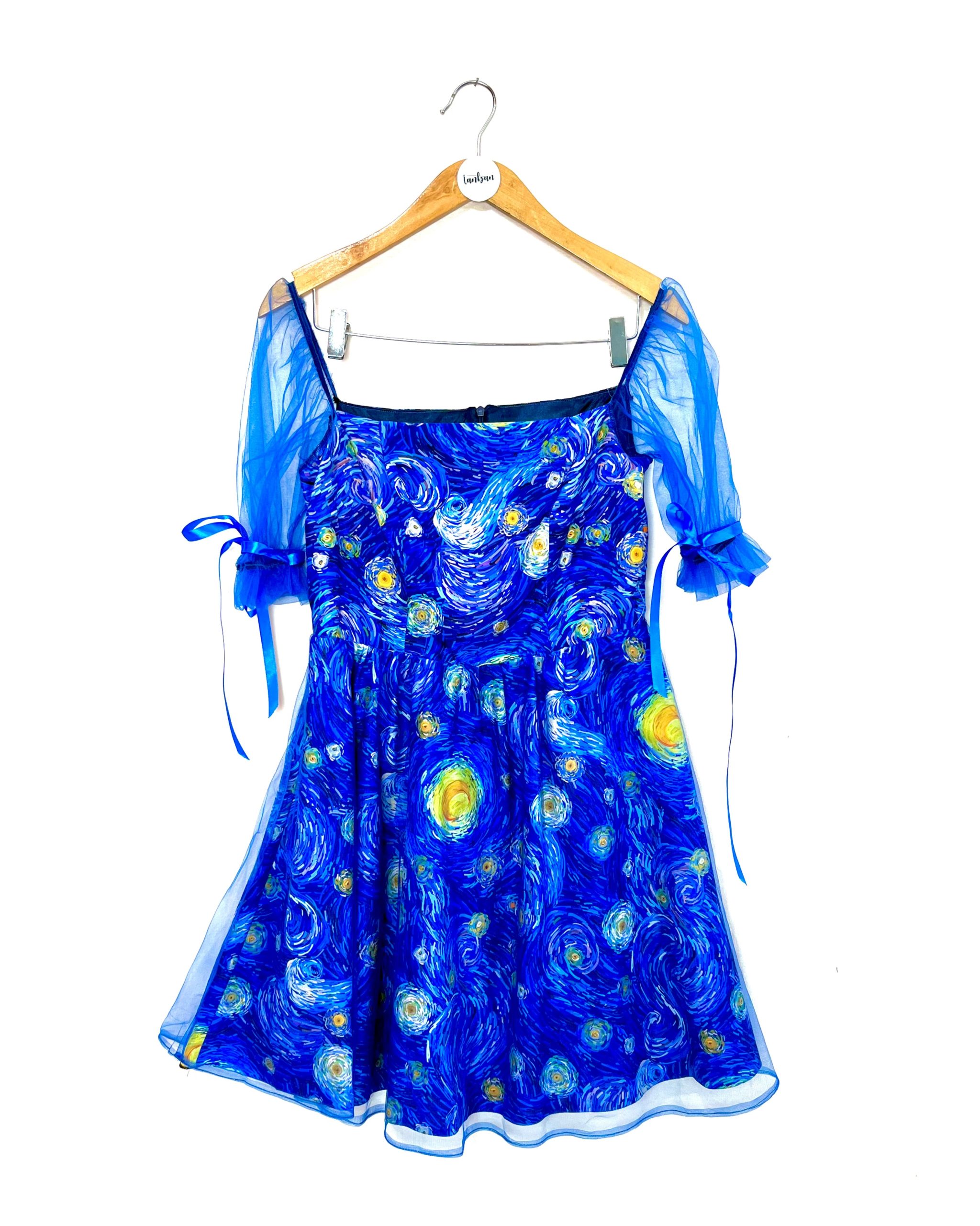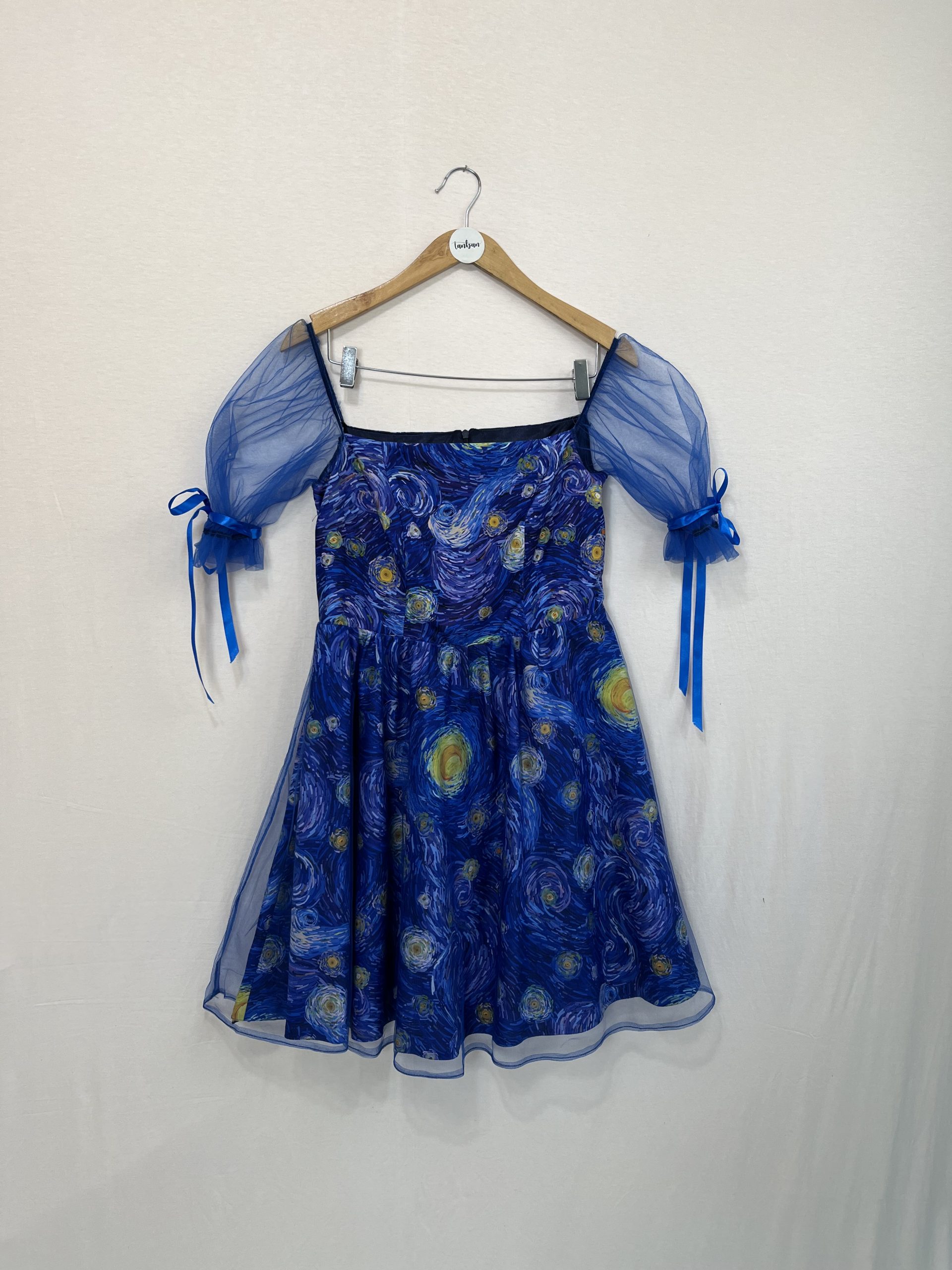 این پیراهن شب پرستاره با پارچه شب پرستاره و تور بعلاوه آستری دوخته شده کنار تور بازوهاش ربان آبی کاربنی داره که میتونید پاپیون برنید و به زیبایی کار اضافه میکنه🥹😍.